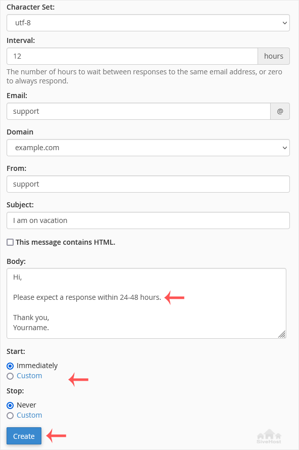 • Email: Enter your email address on which you want to enable autoresponder. To enable auto responder on support@example.com, enter support in the email field.