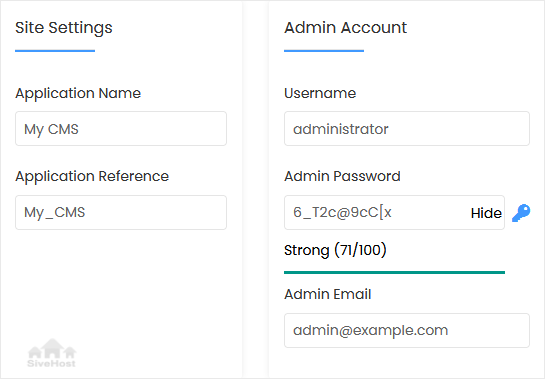 - Admin Username: Your new PyroCMS username (for security reasons, do not use the administrator or the admin username).
